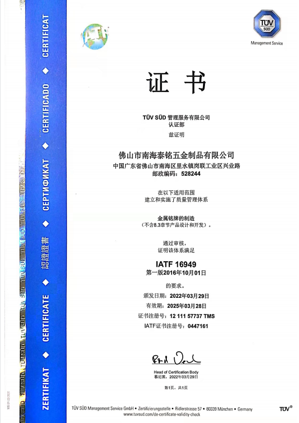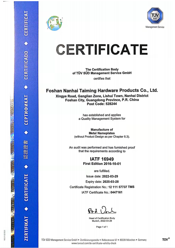 佛山市南海区泰铭五金制品有限公司专业制造各类商标铭牌,从设计——开模——冲压——压铸——电镀——阳极氧化——滴胶——拉丝——喷漆——高光等30多种工艺,公司占地面积达两万平方米,员工500余人,其中高级工程师5名,研发人员10名。主要产品为汽车、灯饰、机车、电机、五金、烤炉、家具等配件,客户以美国、加拿大、日本、澳大利亚、丹麦、西班牙等知名海外厂商为主。